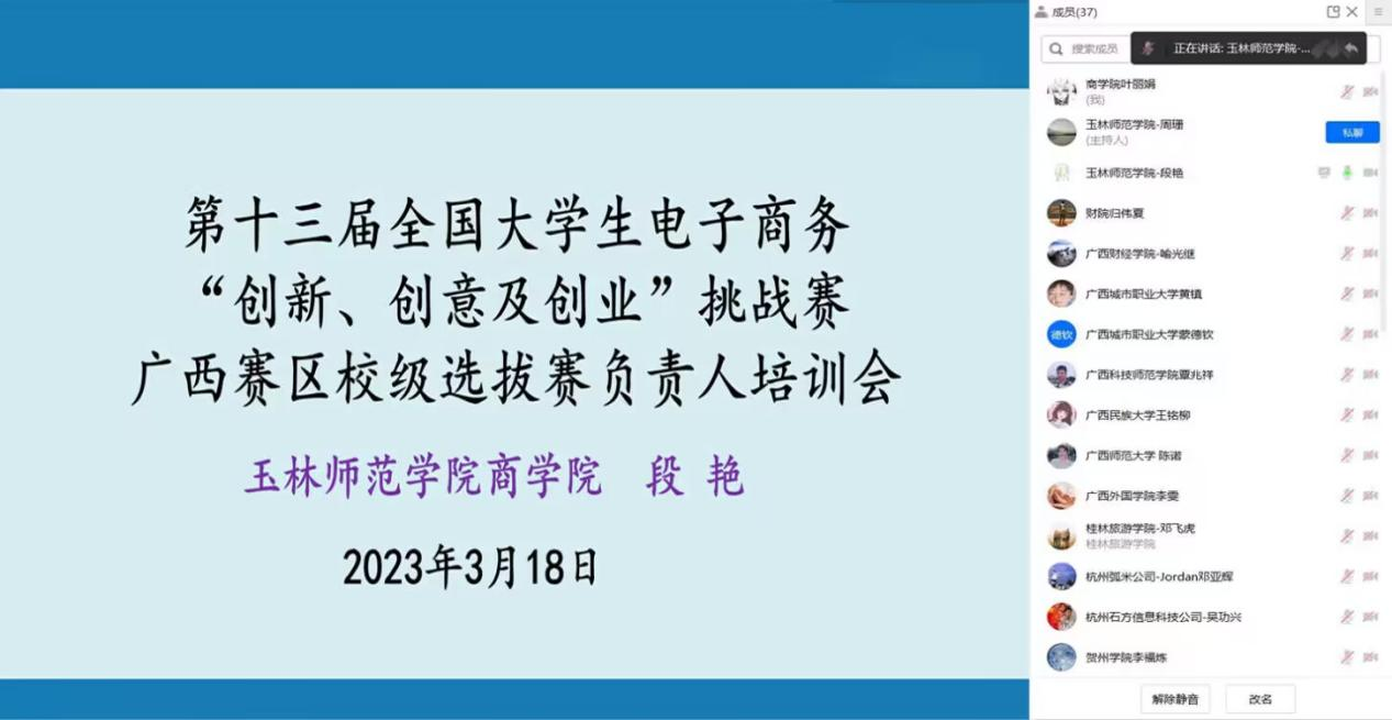 3月18日,必赢3003no1线路检测中心开展第十三届全国大学生电子商务“创新、创意及创业”挑战赛广西校区选拔赛负责人培训线上会议。广西本科高校电子商务及物流类教学指导委员会秘书长、广西财经学院喻光继教授、杭州弧米科技公司邓亚辉、杭州石方信息科技公司吴功兴、必赢3003no1线路检测中心院长许进杰、三创赛竞组委秘书李磊、以及广西赛区各院校三创赛负责人参加此次会议。会议由必赢3003no1线路检测中心副院长段艳主持。