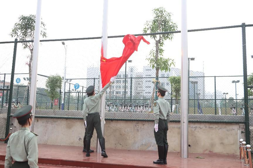 升旗仪式上,英姿飒爽的国旗护卫队护送国旗向升旗台走来,伴随着庄严的《义勇军进行曲》,全体同学怀着对祖国无限的热爱和崇高的敬意,向国旗行注目礼,五星红旗冉冉升起,迎风飘荡。升旗仪式结束后,管金标进行国旗下的讲话,他强调,作为新时代大学生应勇担社会责任和肩上历史使命,热爱祖国,积极报效祖国,希望全体同学以崭新的面貌迎接每一天,丰富自己学习和生活,为建设社会主义文化强国而努力奋斗。
