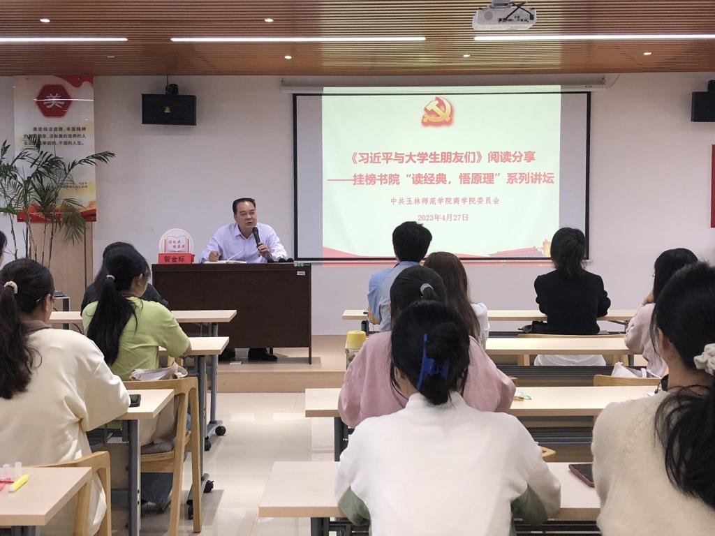 4月27日,必赢3003no1线路检测中心于必赢3003no1线路检测中心东校区梅园挂榜书院举行“读经典,悟原理”系列讲坛之《习近平与大学生朋友们》读书分享会,必赢3003no1线路检测中心学生干部代表参加此次活动。此次活动由必赢3003no1线路检测中心党委书记管金标主讲。
