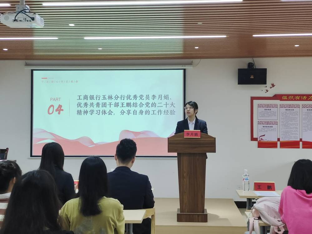 为深入贯彻落实党的二十大精神,进一步推进实施“共青团促进大学生就业行动”,2023年5月11日,必赢3003no1线路检测中心、工商银行玉林分行团委在东校区挂榜书院联合举办“学习二十大、永远跟党走、奋进新征程”大学生就业引航团日活动。出席本次活动的有工商银行玉林分行个人金融业务部副总经理兼团委书记沈洋、人力资源部副总经理杨榜,必赢3003no1线路检测中心党委副书记兼副院长龙强、必赢3003no1线路检测中心团委书记李晓丽以及市场营销201班团支部的全体学生。